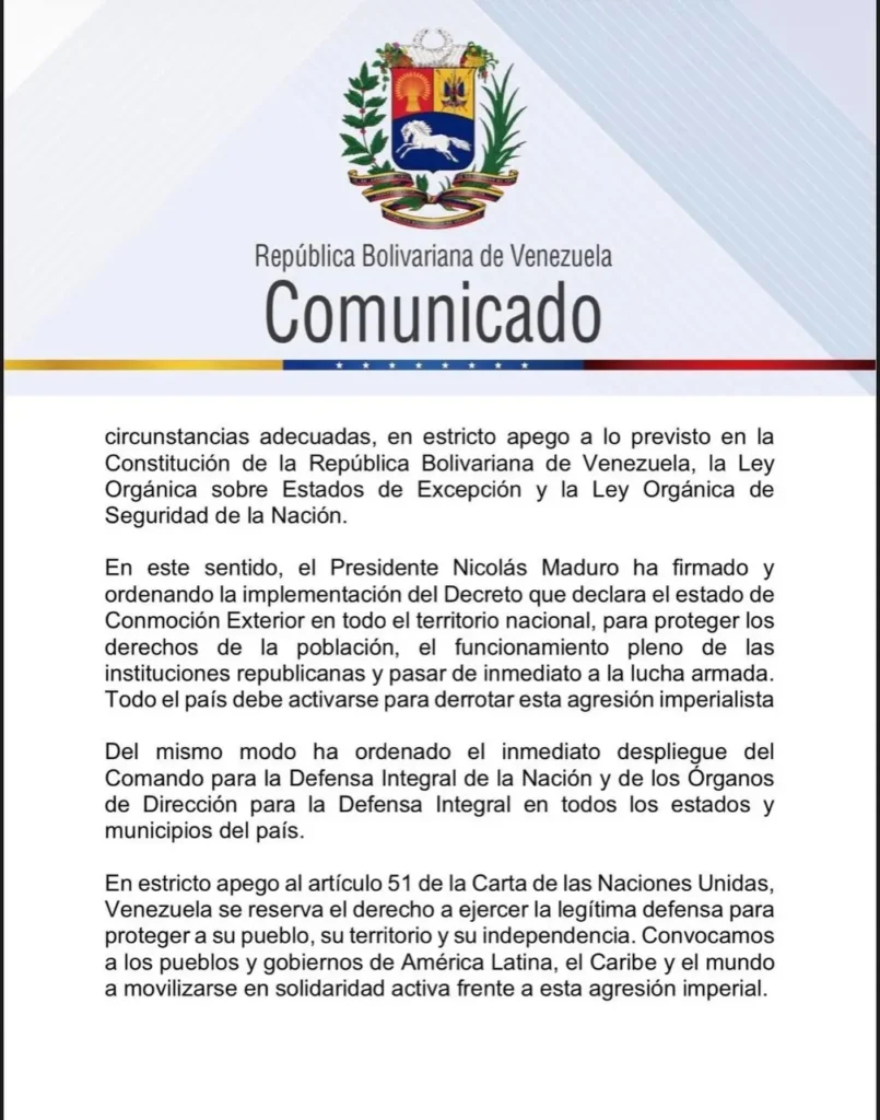 El Gobierno venezolano aseguró que continuará informando a la ciudadanía sobre el desarrollo de la situación y reiteró su disposición a establecer relaciones internacionales basadas en el respeto mutuo y el cumplimiento de la legalidad. La declaratoria de conmoción externa marca un nuevo capítulo en la coyuntura política del país, mientras las autoridades insisten en la defensa de la institucionalidad.